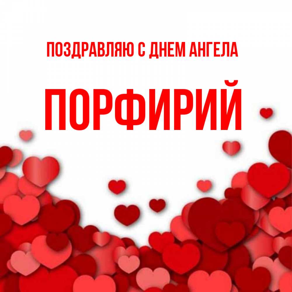 Открытка Поздравляю с днем Ангела Порфирий. Я тебя люблю картинка с сердечками и красной подписью. много красных сердечек о любви