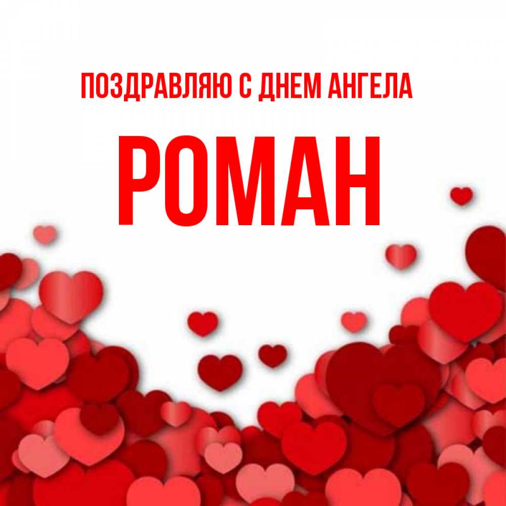 Открытка Поздравляю с днем Ангела Роман. Я тебя люблю картинка с сердечками и красной подписью. много красных сердечек о любви