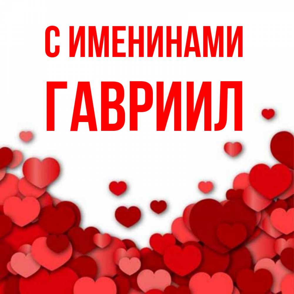 Открытка С именинами Гавриил. Я тебя люблю картинка с сердечками и красной подписью. много красных сердечек о любви