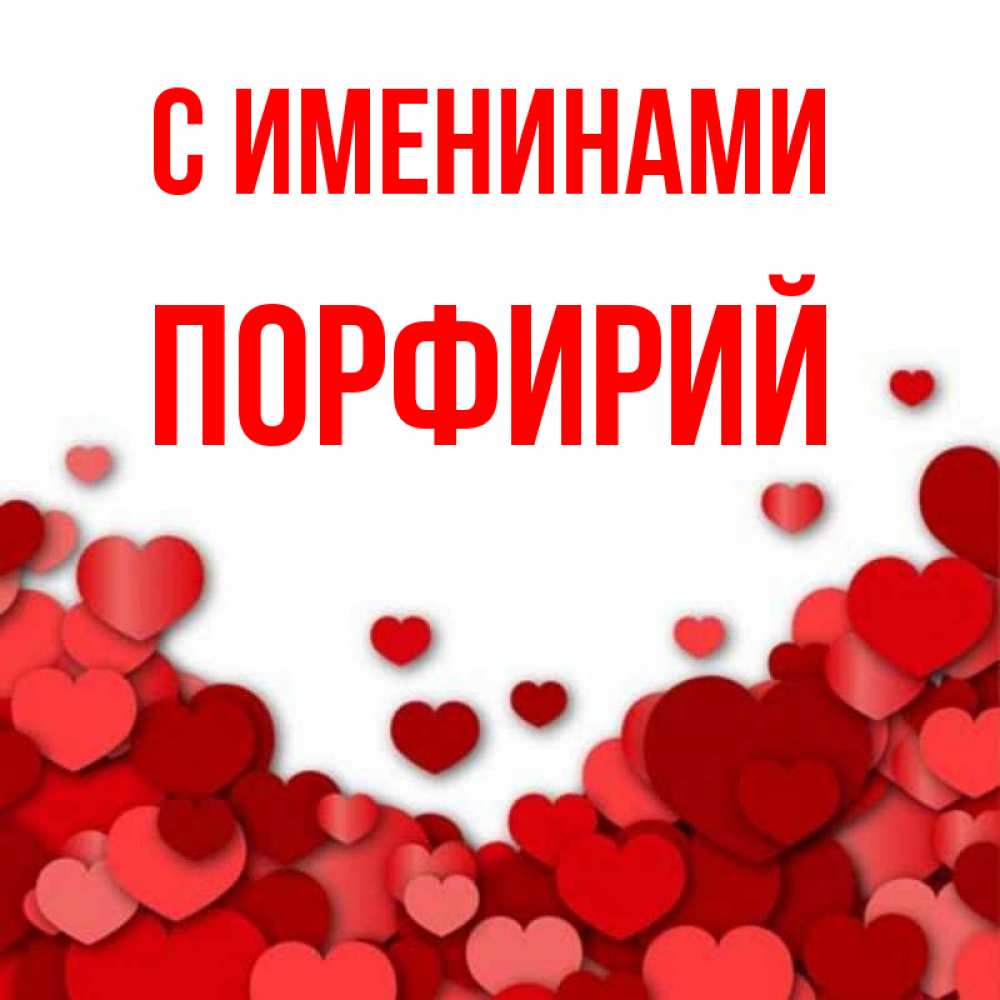 Открытка С именинами Порфирий. Я тебя люблю картинка с сердечками и красной подписью. много красных сердечек о любви